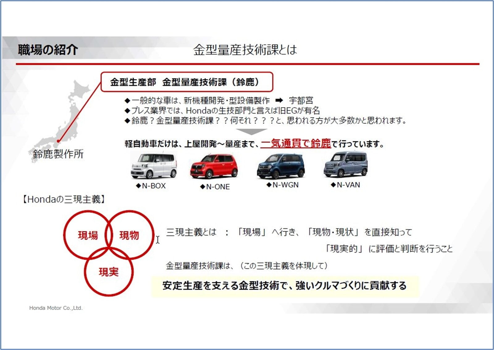 島田氏 それぞれ経歴は異なりますが、生技性検討から量産の困り事解決まで、全体を担えるエンジニアを長年かけて育成し、個々の能力を高めていくことで、クルマづくりに貢献しているのが、鈴鹿の金型領域です。