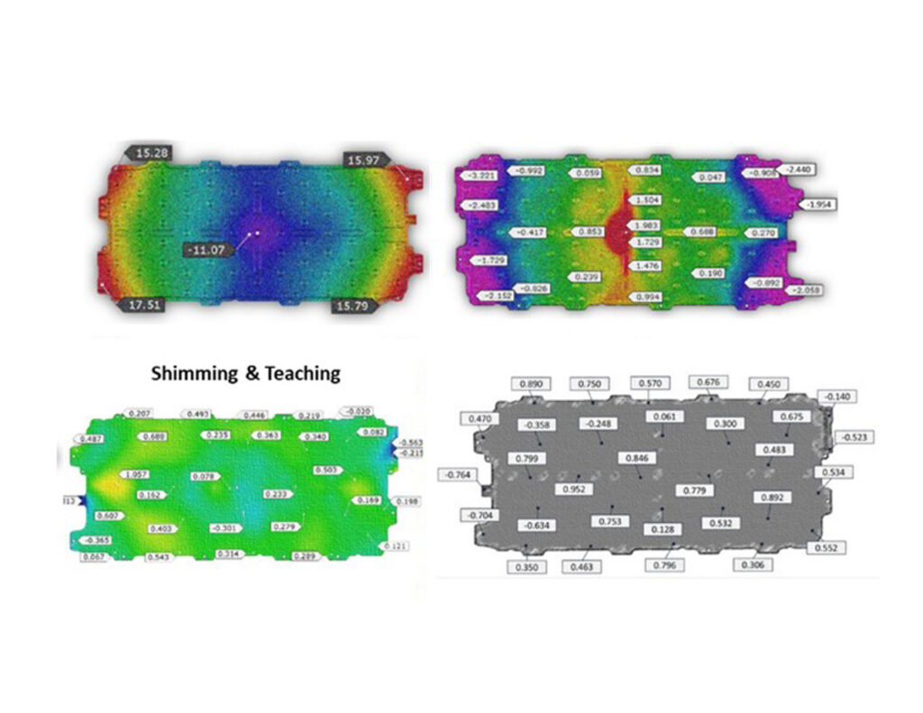 インドのプネに拠点を置くSKH SMC社は、精度、効率、コスト管理が最優先される1次サプライヤです。同社はインドのオートフォーム社と提携し、デジタルツイン技術と高度なアセンブリシミュレーションを効果的に活用しています。電気自動車(EV)用バッテリーボックスのセパレータープレートの製造における深刻な問題の解消に取り組み、革新的な思考から成果を得られることを実証しました。 本稿では、従来のプレス成形の修正からアセンブリのバーチャルシミングおよびティーチングへと手法を転換する上で、事業面での便益、技術戦略、資源節減効果、および考慮すべき影響について考察します。この手法の転換によって再加工やトライアウトのコストを削減し、プロジェクトのリードタイムを大幅短縮することが可能となりました。 背景:パネルからアセンブリまでの公差 検討する部品は、EVバッテリーボックスのバッテリーパックを分離するために必要なバッテリーのセパレータープレートです。これは以下2つのコンポーネントで構成されます。 • ベースプレート、および • 剛性を高めるために複数のエンボス加工が施された構造用プレート 本稿では主に構造用プレートを扱います。このプレートをバッテリーパックに組み込むには、最終アセンブリにて厳密な平坦度公差を満たさなければなりません。そのためSKH SMC社では、アセンブリに求められる平坦度仕様に合致する平坦なパネルの製造を目標に掲げました。 従来、スプリングバックの偏差はプレス成形工程で見込み補正していましたが、金型コンポーネントの再加工に膨大な時間とコストを要していました。プレス成形シミュレーションのコミュニティサイトであるJapanForming.comに掲載されているブログ記事(アセンブリ工程の最適化:部品の最適化を代替する戦略的手法 – EVバッテリーケースの製造に関する事例紹介)では、AutoFormソフトウェアでバッテリープレートのシミュレーションを行い、仕様を大幅に超える15mmのスプリングバックを特定した事例を詳細に紹介しています。この事例からも、従来の手法では不具合対応に限界があることが実証されています。 プレス成形工程で生じる偏差を見込み補正する手法の代替として、アセンブリ工程でスプリングバックを管理する手法を検討しました。プレス成形したパネルは剛性が低いため、アセンブリ工程で修正ができます。特にシミングクランプや溶接機のティーチングを活用すれば、フォーム金型を修正することなくスプリングバックを管理することが可能になります。 本共同プロジェクトは、ホワイトボディ(BIW)工程の詳細かつ高精度なバーチャルモデルである真のデジタルプロセスツインの構築を中心に進められました。特に特徴的なのは、プレス成形工程のCAE結果をアセンブリシミュレーションへ直接組み込んだ点であり、これによりプレス成形工程で生じた偏差が最終アセンブリに及ぼす影響を包括的に把握することができるようになりました。 図1. プレス成形&BiWアセンブリのエンジニアリングにて、デジタルプロセスツインのコンセプトを活用 戦略の転換:アセンブリシミュレーションとバーチャルシミング このプロジェクトでは、プレス成形中に変形したパネルを組み立てる際の挙動をシミュレーションすることを目標に定めました。スポット溶接においてシミングとティーチングを戦略的に調整することで、この変形を補正することができるかを検証しました。変形を効果的に補正できれば、膨大なコストをかけてプレス金型を修正する必要がなくなります。 アセンブリシミュレーションの結果は良好でした。シミングやティーチングを通じてプレス成形で生じた変形を修正でき、凸状の変形が凹状に変化するなど、大きな変形が効果的に解消されました。これにより、アセンブリ工程中に「バーチャルシミングおよびティーチング」の適用、つまりシミュレーションしたオーバーベンドとクランプの再配置を通じて、不具合を解消し、目標形状を得るための道筋が立ちました。 SKH SMC社プネ工場では、バーチャルの検証結果をすぐに製造現場へ取り入れました。CMM(三次元測定機)による測定結果はシミュレーション結果とほぼ一致し、デジタルツインの有効性が証明されました。 図2. プレス成形からアセンブリ、そして実部品への偏差の変化 アセンブリシミュレーションを活用した手法の利点 コストへの影響:金型の再加工を回避 従来の生産環境において、15mmという大きなスプリングバックに対処するには、少なくとも3回の品質ループ(再加工、プレスのトライアウト、測定)が必要となります。それぞれ最大3週間を要するため、多大な資本や工数が生じます。 従来の修正プロセスには、通常、以下が必要となります。 1. プレス成形工程の見直しと最適化(サプライヤと協働) 2. 複数回の再研削や再加工による金型形状の微調整 3. 軽微な寸法修正にはリストライク金型の追加 SKH SMC社ではアセンブ