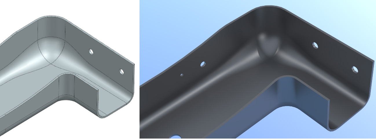 圧縮効果を最小限に抑えるため、まず比較的軽微な修正として、ブランクプロファイルを調整しました(図8)。しかしこれだけでは不具合を完全に解消できません。別のソフトウェアリソースであるAutoForm-DieDesignerを使用して、金型形状を修正し、金型との接触ポイントにおけるシートの圧縮を緩和することで、当該領域の方向に沿ってより均一な応力分布を担保しました(図9)。両手法を組み合わせることで、満足のいく結果が得られたため、金型部門へ検証と実装を依頼しました。