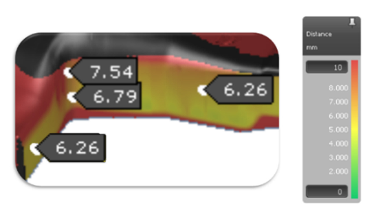 これらの不具合を解消するため、生産支援として採用された手法の一つが、サーフェススキャナーとAutoForm Formingを用いた金型のリバースエンジニアリングでした。金型の実際の状態をスキャナーで計測すると、ダイとパンチ間の距離にばらつきがあることが明らかになりました(図5)。基準板厚に応じて6mm前後の値が想定されていましたが、鋼材への過度な圧力と板厚増加により、一部の領域で金型のギャップは最大7.5mmに達していました。