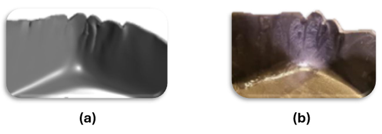 図7: (a) シミュレーションと(b)実部品の金型摩耗の比較