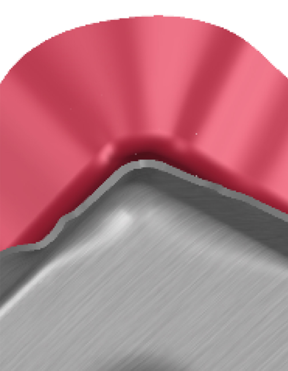 特に深刻な不具合として、過剰なしわが確認されました(図2)。部分的には修正が可能でしたが(図3)、修正ができない箇所については廃棄せざるを得ませんでした。過剰なしわによって材料が重なり、局所的な変形が助長されると、材料の硬化が生じ、最終的には破断に至ります。